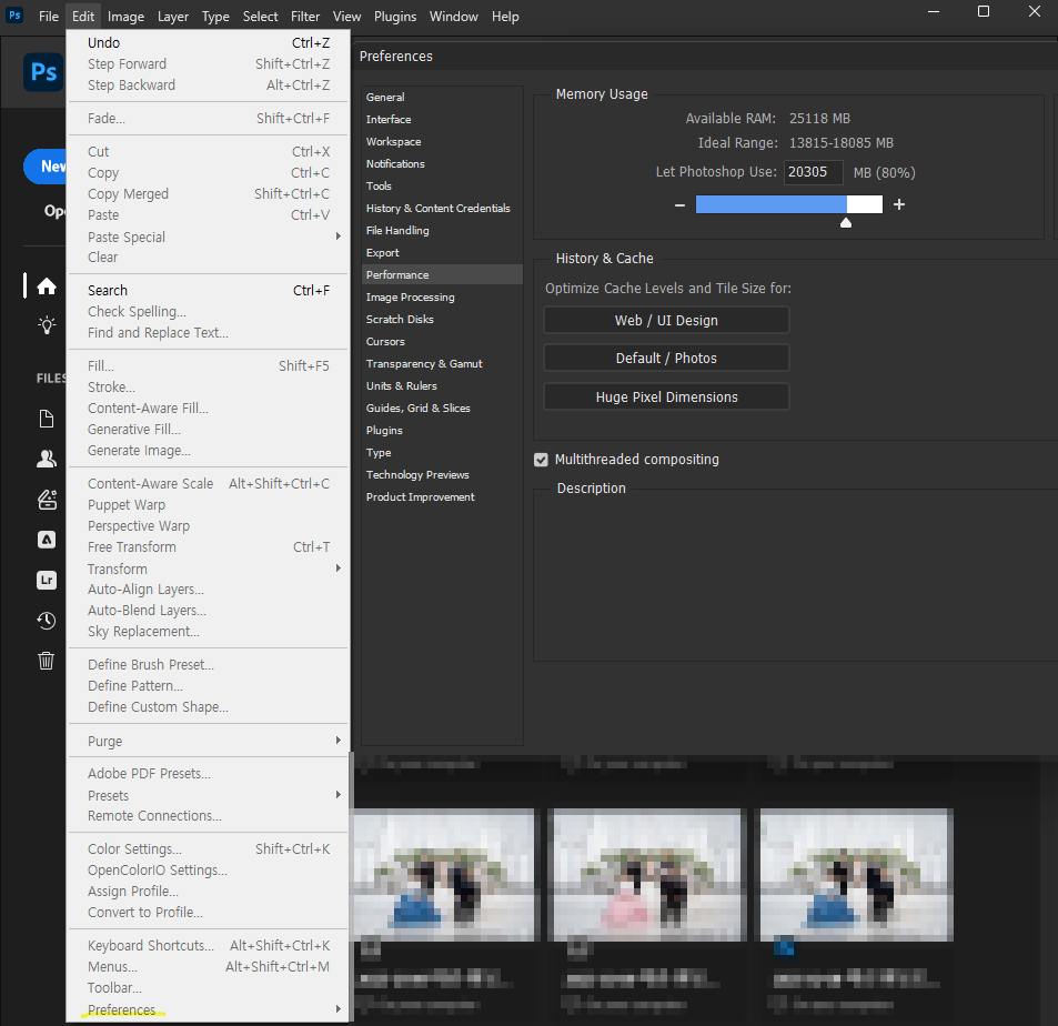 1. 포토샵 상단 메뉴에서 [편집(Edit)] > [환경설정(Preferences)] > [성능(Performance)]을 순서대로 클릭합니다.