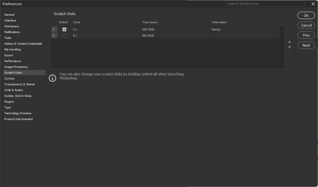 만약 C드라이브(기본 부팅 디스크)의 용량이 물리적으로 부족한 상태라면, 용량이 넉넉한 다른 드라이브(D드라이브 등)를 스크래치 디스크로 활용하도록 설정해야 합니다.