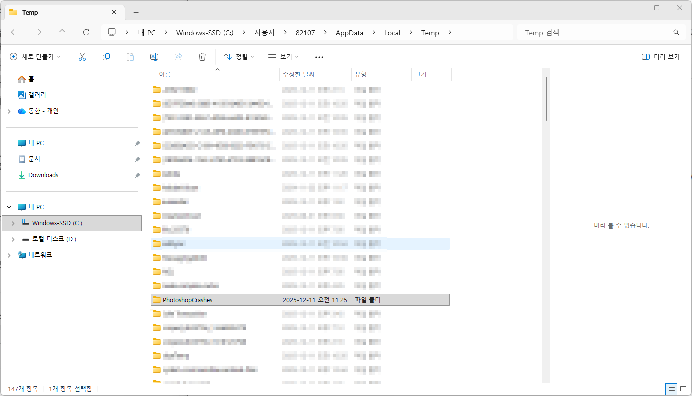이렇게 임시 파일만 정리해도 몇 기가바이트(GB)의 공간이 확보되어 오류가 해결될 수 있습니다.